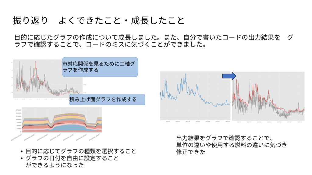 併せて、業務を通じて、「コード作成のミス軽減」技術が身についたと報告しました。デバッグツールやグラフでの可視化がミスの削減につながったとのことです。