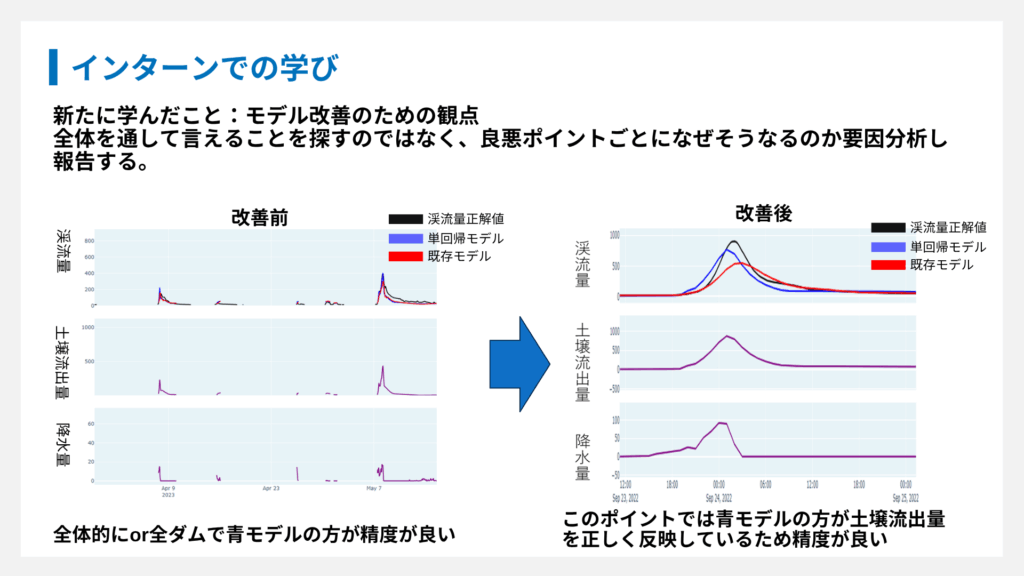 具体的には、AIモデル全体を一括して評価するのではなく、予測の精度が良好なポイントと問題点それぞれについて「なぜその結果になったのか」を要因分析することの重要性を学んだとのことでした。