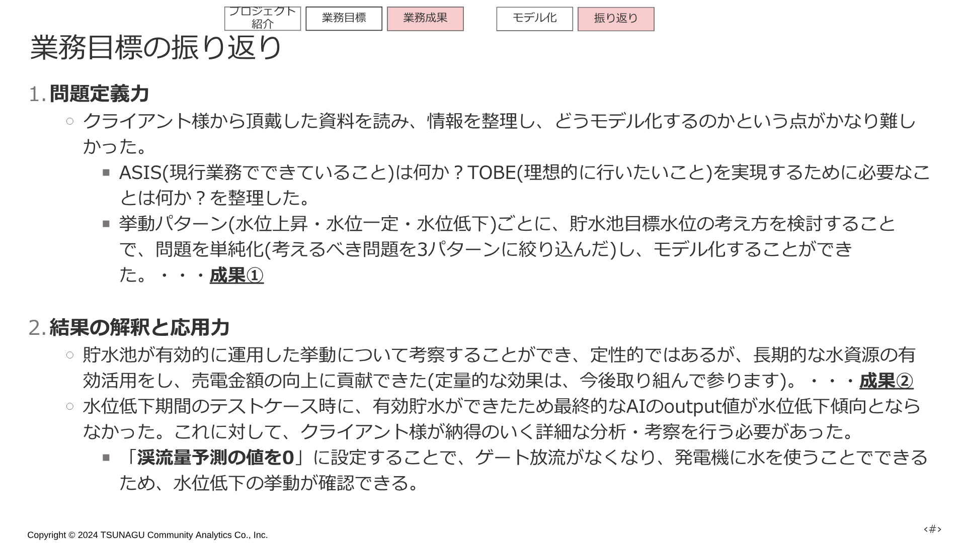 成果発表会では、各貯水池の運用方針を理解した上で、AIが出力した目標水位が妥当であるかを、あらゆるケースを想定して検証した実績を報告しました。